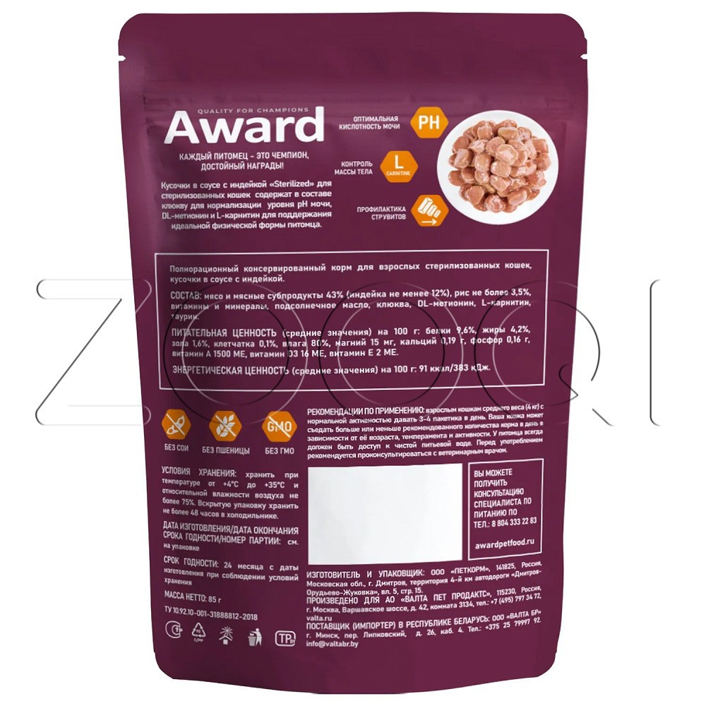 Award Sterilized Adult Turkey – полнорационный консервированный корм, кусочки в соусе с индейкой для взрослых стерилизованных кошек.