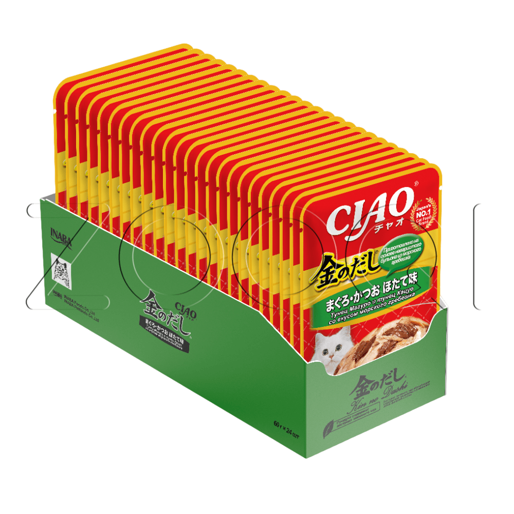 INABA CIAO Kinnodashi (Чао Киннодаши) – супер-премиальный влажный корм для кошек от японского производителя INABA, приготовлен на основе кусочков двух разных видов мяса глубоководного тунца с морским гребешком в аппетитном насыщенном бульоне золотистого цвета. Внутри упаковки пауча ароматные нежные волокна в желе, которые подойдут даже самым привередливым кошкам и кошкам с чувствительным пищеварением.