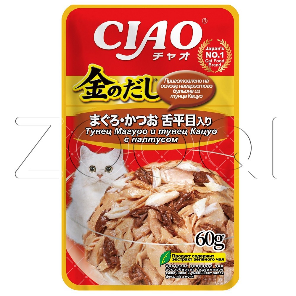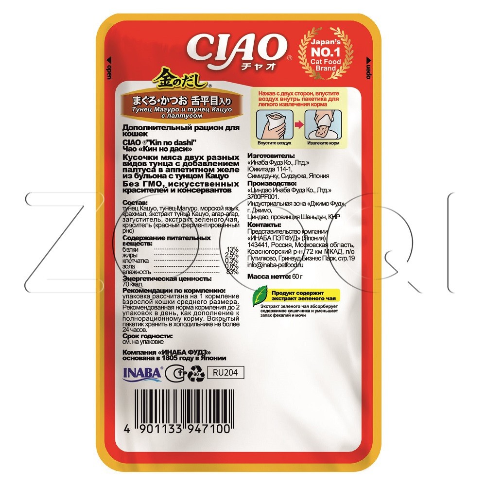 INABA CIAO Kinnodashi (Чао Киннодаши) – супер-премиальный влажный корм для кошек от японского производителя INABA, приготовлен на основе нежных кусочков мяса двух разных видов глубоководного тунца с добавлением палтуса в аппетитном насыщенном бульоне золотистого цвета. Внутри упаковки пауча ароматные нежные волокна в желе, которые подойдут даже самым привередливым кошкам и кошкам с чувствительным пищеварением.