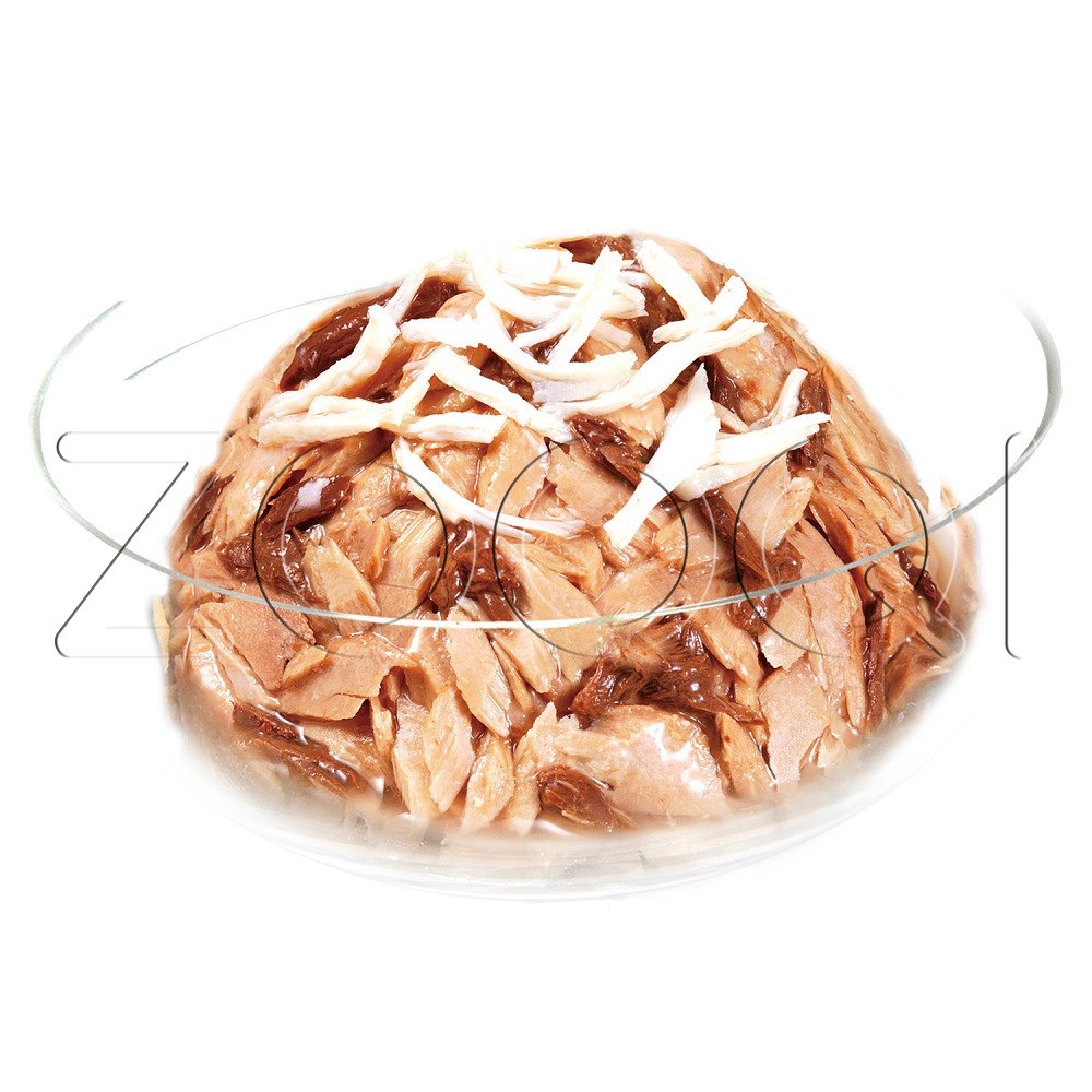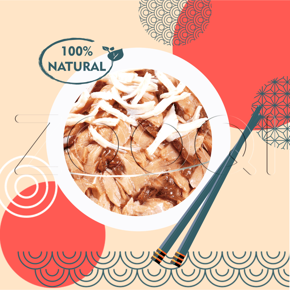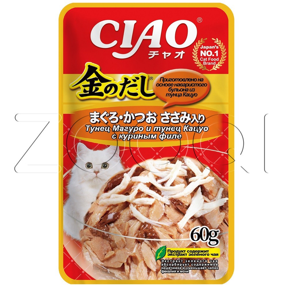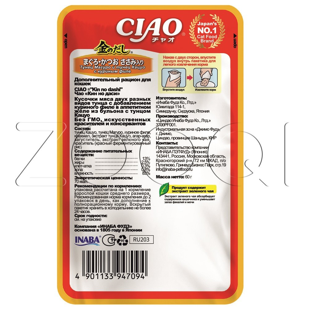 INABA CIAO Kinnodashi (Чао Киннодаши) – супер-премиальный влажный корм для кошек от японского производителя INABA, приготовлен на основе кусочков двух разных видов мяса глубоководного тунца и филе фермерской курицы в аппетитном насыщенном бульоне золотистого цвета. Внутри упаковки пауча ароматные нежные волокна в желе, которые подойдут даже самым привередливым кошкам и кошкам с чувствительным пищеварением.
