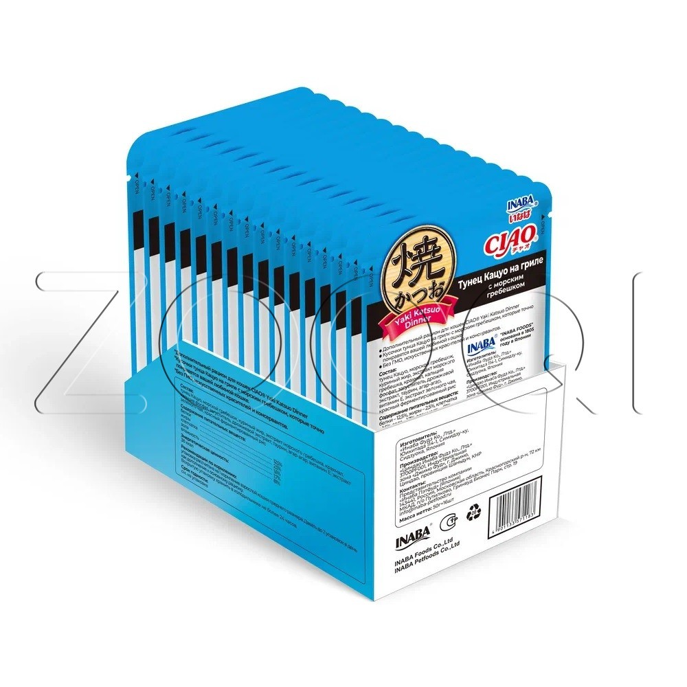 INABA CIAO Yaki Katsuo Dinner (Чао Яки Кацуо Диннер) – супер-премиальный влажный корм для кошек от японского производителя INABA, приготовлен на основе кусочков мяса тунца Кацуо, приготовленного на гриле, с добавлением морского гребешка. Внутри упаковки пауча ароматные нежные волокна в соусе, которые подойдут даже самым привередливым кошкам и кошкам с чувствительным пищеварением.