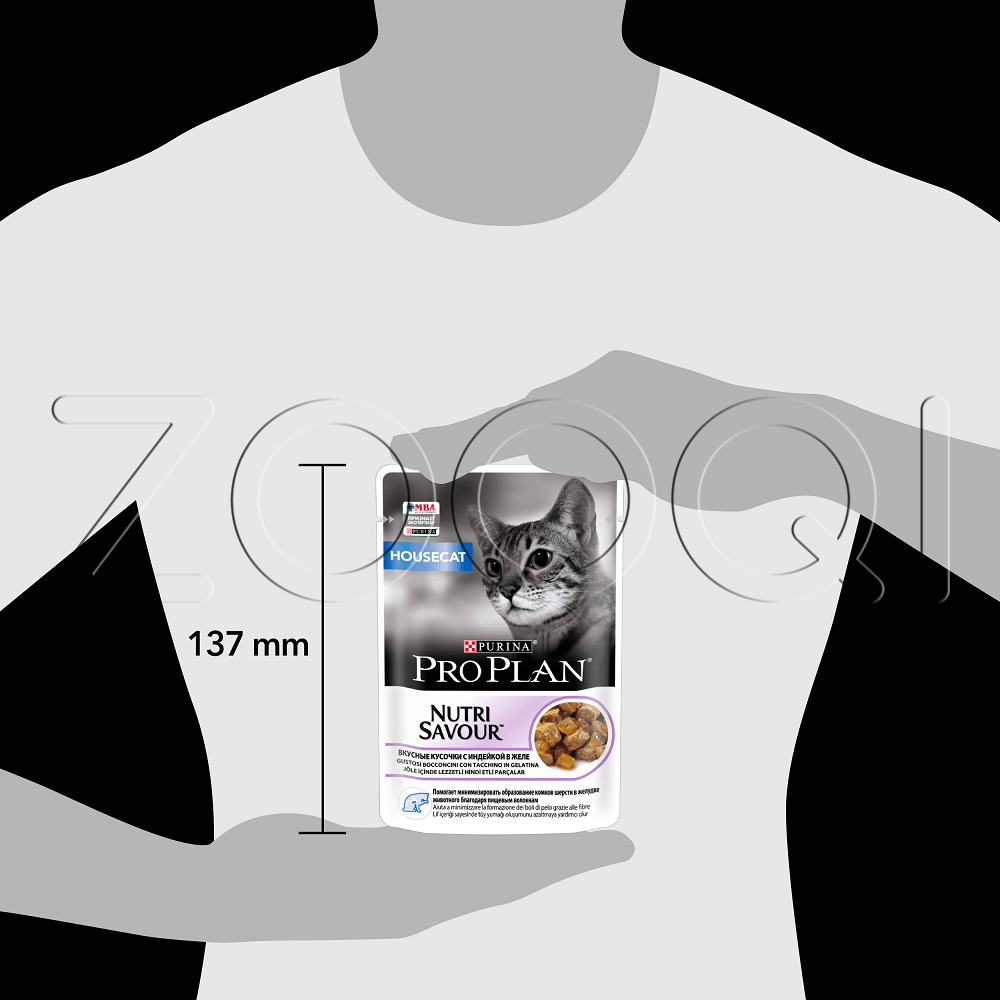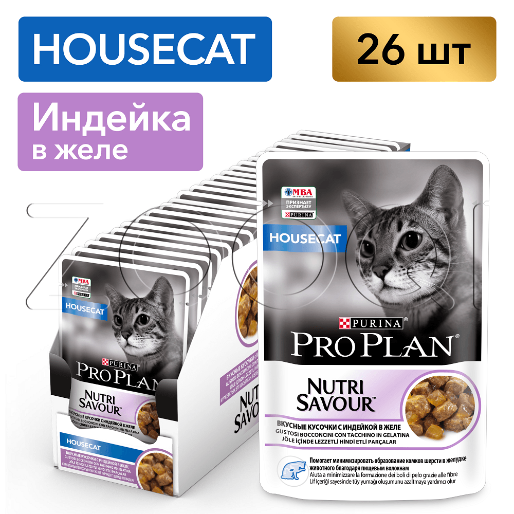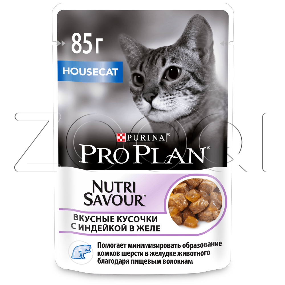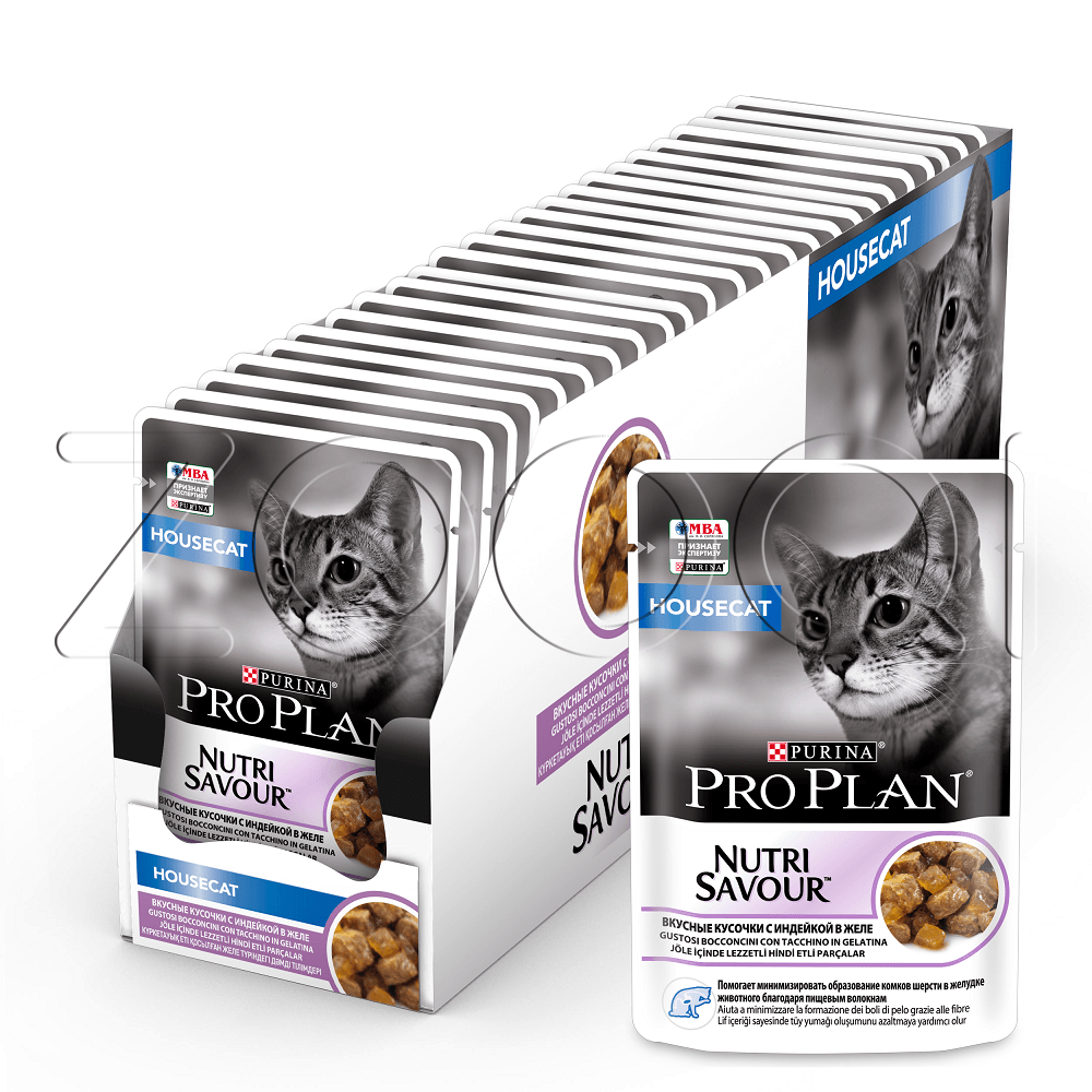 Purina Pro Plan Indoor Adult — консервированный полнорационный корм с индейкой в желе для взрослых кошек живущих дома.