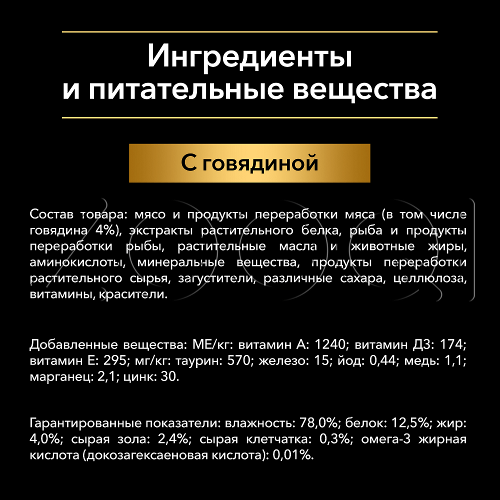 Мясо и мясные ингредиенты (из которых говядина 4%), экстракты растительного белка, аминокислоты, рыба и продукты ее переработки, масла и жиры, минеральные вещества, продукты переработки растительного сырья, сахара, загустители, витамины.