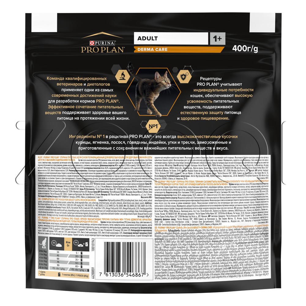 Purina Pro Plan Derma Care Adult — полнорационный сухой корм с высоким содержанием лосося для здоровья шерсти и кожи взрослых кошек.