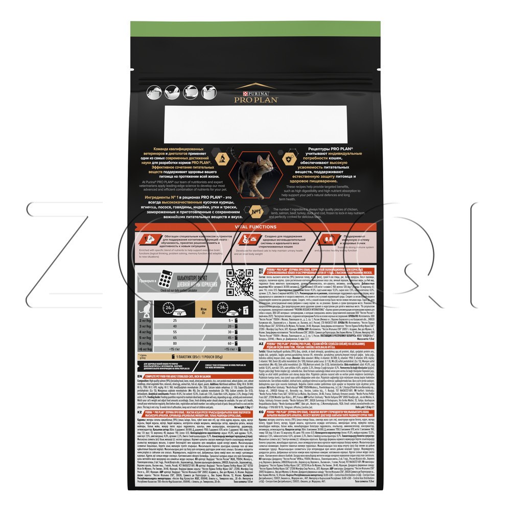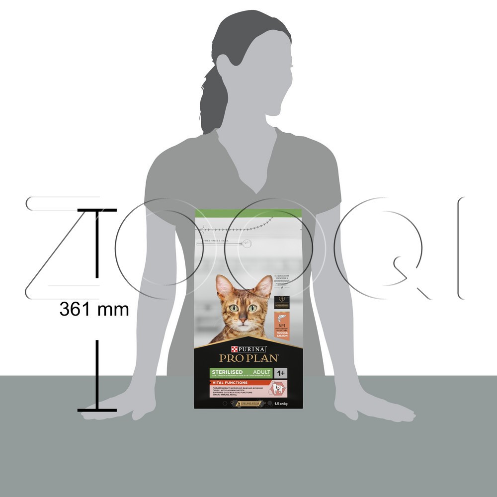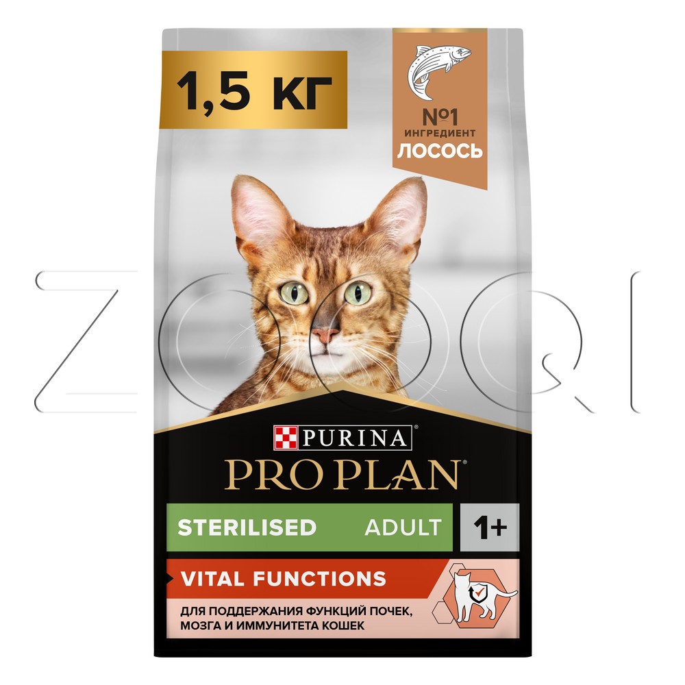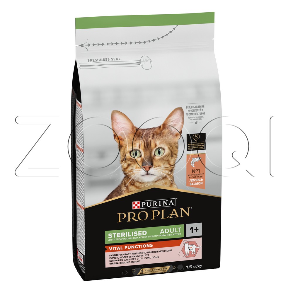 Purina Pro Plan Vital Functions Sterilised Adult — полнорационный сухой корм с высоким содержанием лосося для стерилизованных кошек и кастрированных котов, для поддержания функций почек, мозга и иммунитета.