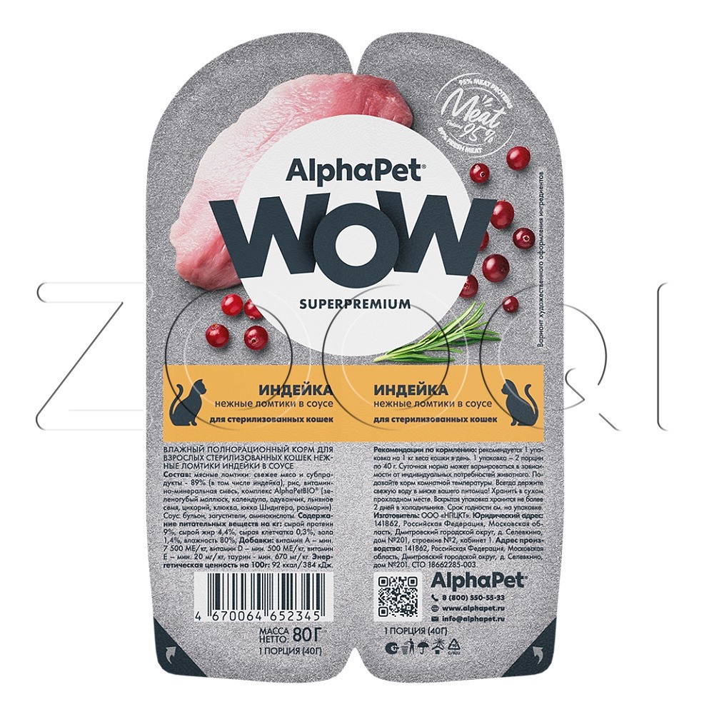 AlphaPet WOW Superpremium — влажный полнорационный корм для взрослых стерилизованных кошек, нежные ломтики индейки в соусе.