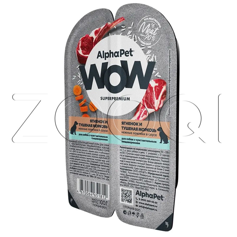 AlphaPet WOW Superpremium — влажный полнорационный корм для собак с чувствительным пищеварением нежные ломтики ягненка и тушеная морковь в соусе.