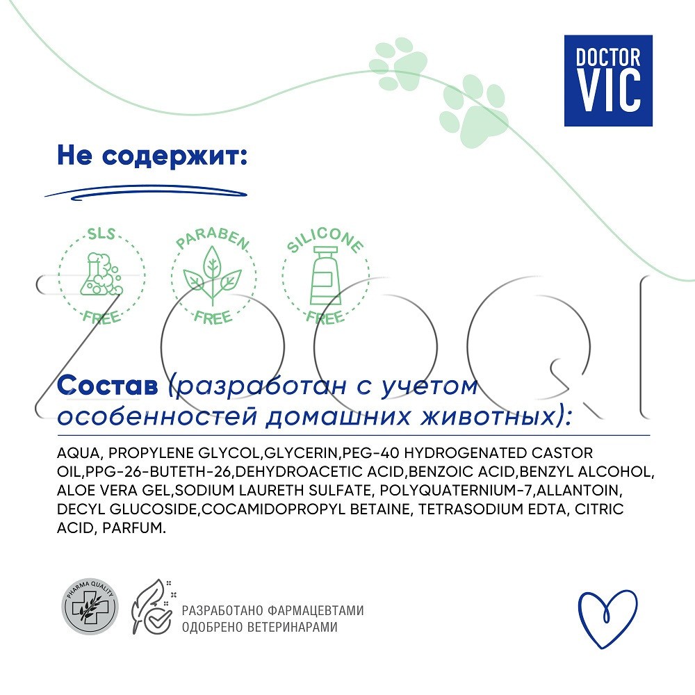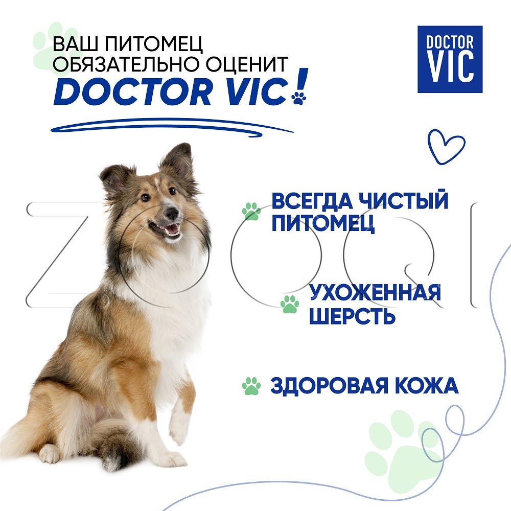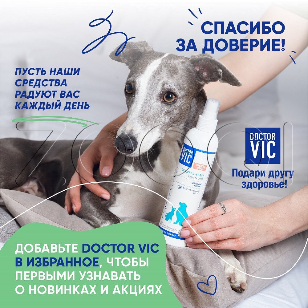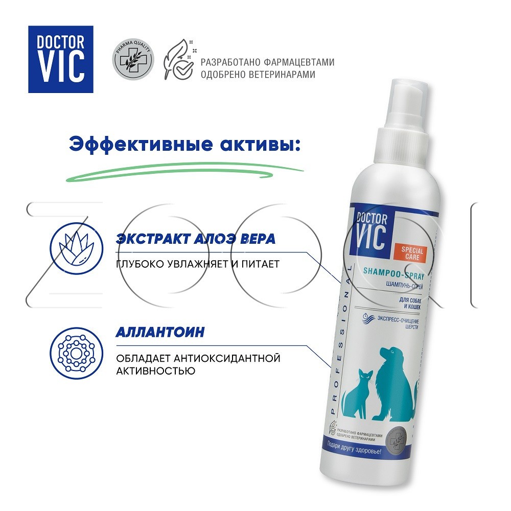 DOCTOR VIC Шампунь-спрей предназначен для экспресс-очищения шерсти собак и кошек, щенков и котят. Рекомендуется для животных, которые боятся воды, в период между купаниями, для быстрого очищения наиболее загрязнённых мест (лап, живота, подбородка), для больных и ослабленных животных.