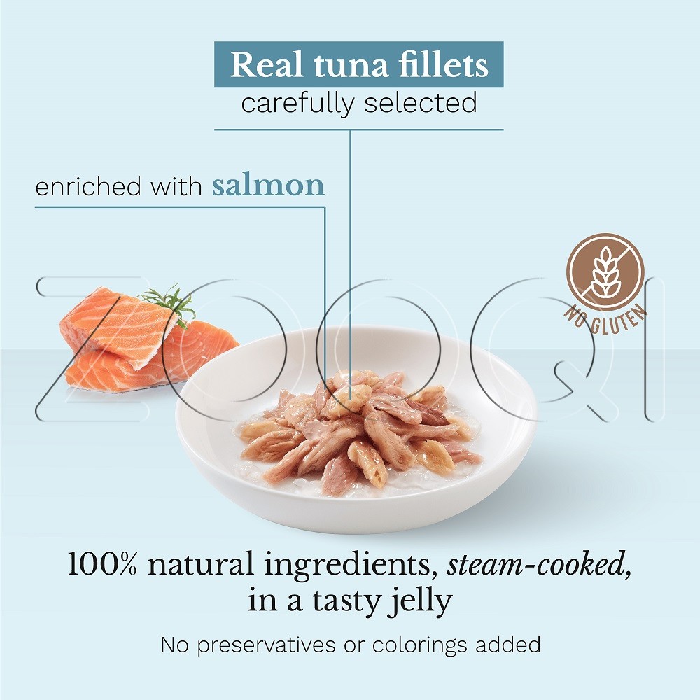 В основе рецепта – настоящее филе вкуснейшего тунца в сочетании с лососем, ароматной рыбой, которая, как известно, богата Омега-3. Блюдо подается в желе, чтобы удовлетворить вкусы кошек, которые любят морепродукты в сочетании с более плотной консистенцией в миске.