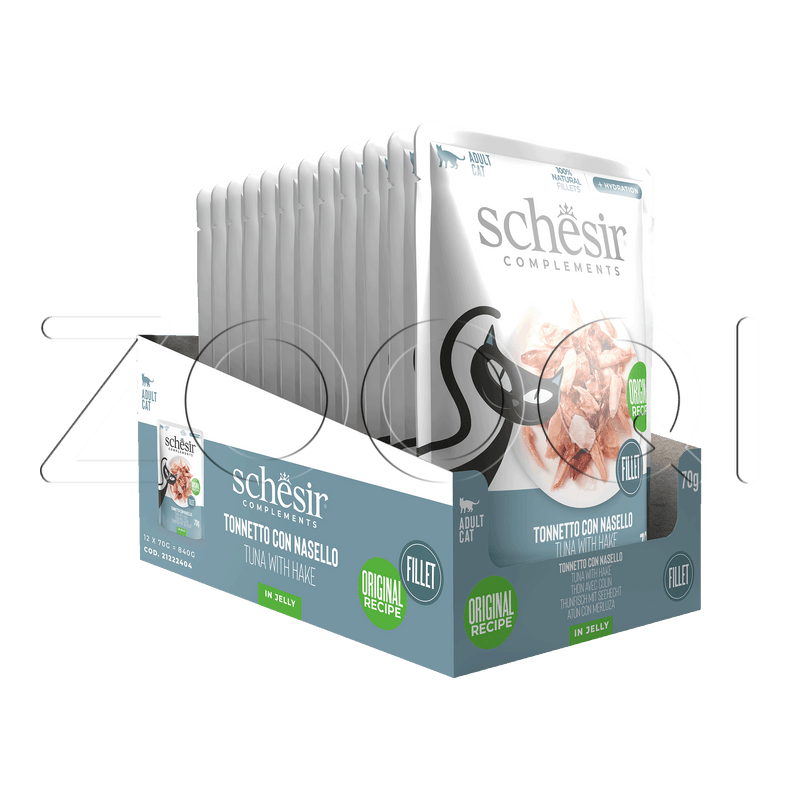 Schesir Cat Complements Tuna with Hake in jelly — влажный корм с тунцом и хеком в желе для взрослых кошек.