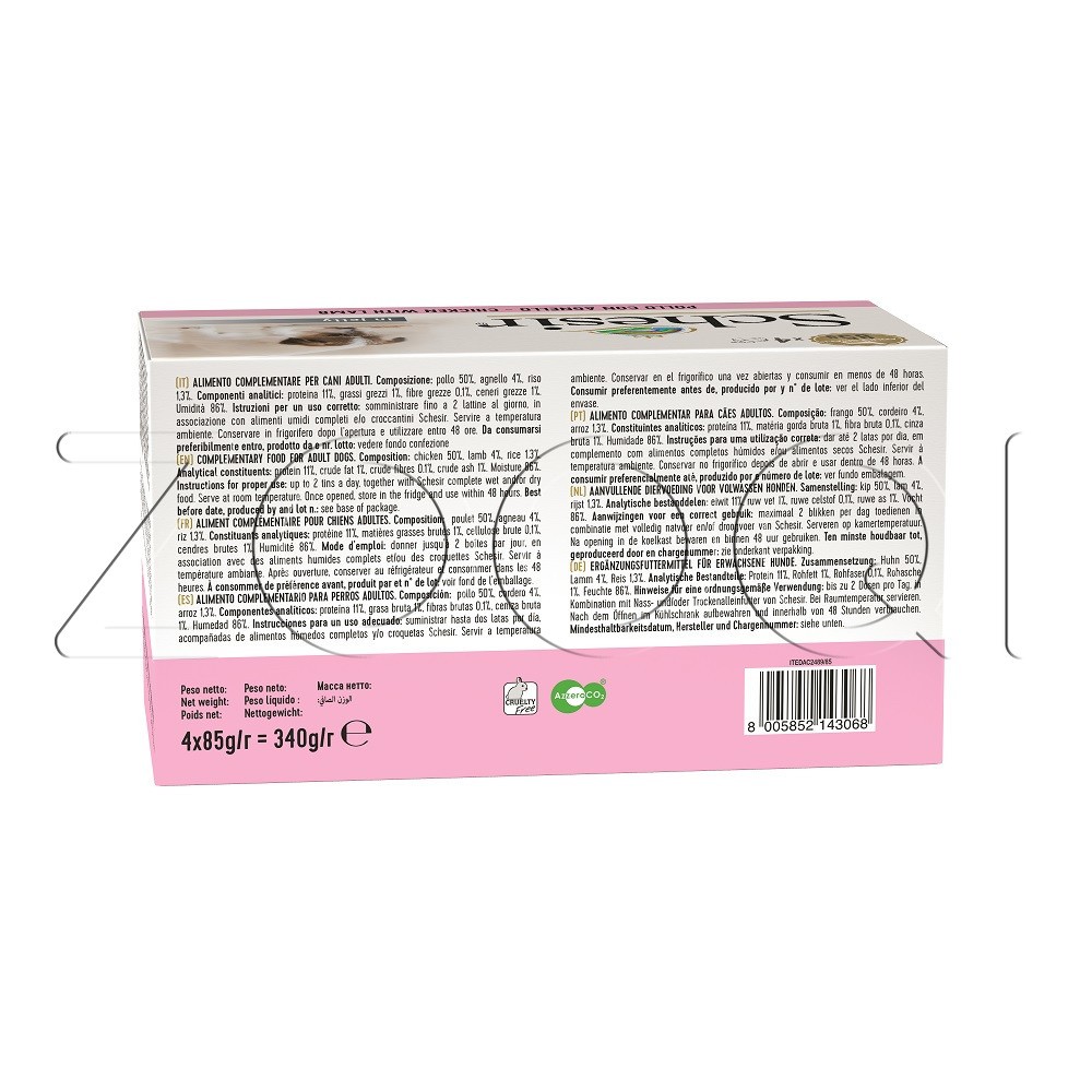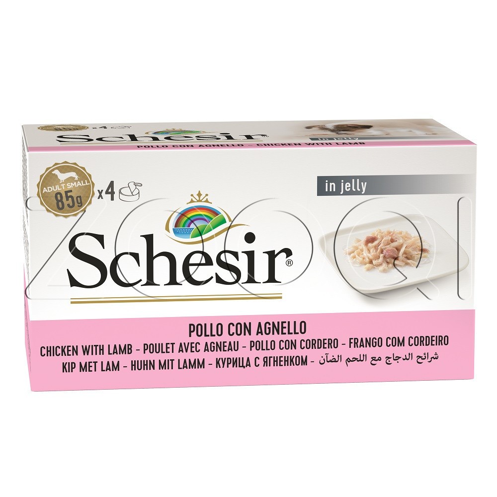 Schesir Dog Adult Small Chicken Fillets with Lamb in jelly — дополнительный влажный корм с курицей и ягненком в желе для взрослых собак мелких пород.