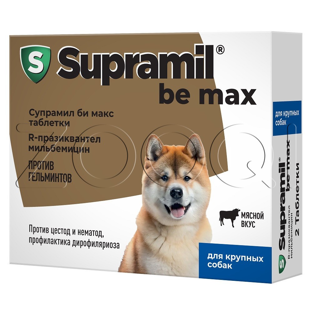 Супрамил би макс (Supramil be max) – антигельминтный препарат широкого спектра действия с улучшенным составом для собак крупнных пород (1 таблетка на 25 кг). Supramil be max максимально безопасно воздействует на организм животных.