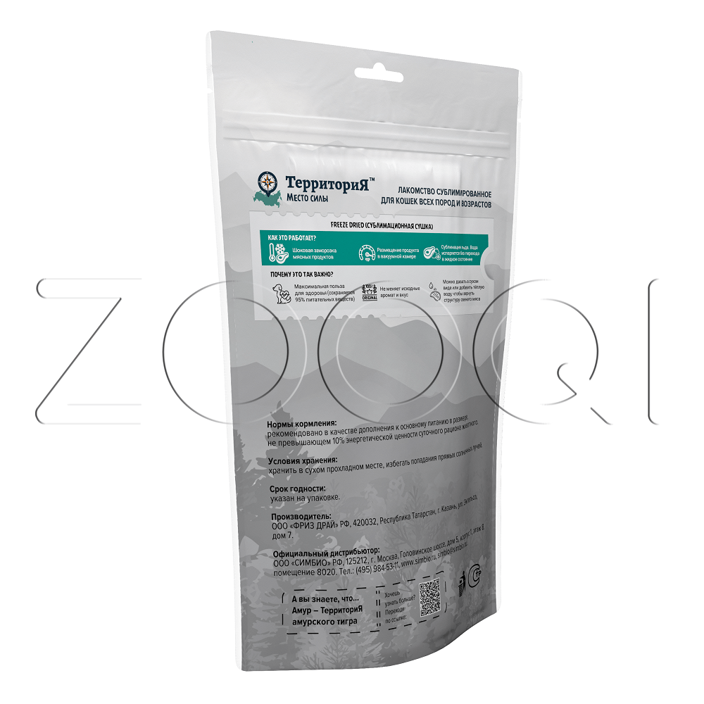 Все ингредиенты для лакомств ТерриториЯ поступают на производство в свежем виде. Там для сохранения своих полезных свойств они проходят сверхбыстрое замораживание. Затем в вакуумной камере происходит процесс сублимации, в результате чего замёрзшая влага в ингредиентах испаряется без перехода в жидкое состояние. Это значит, что удаляется только вода, а лакомство сохраняет все свои полезные свойства. Сублимированные продукты не меняют исходные аромат и вкус.
