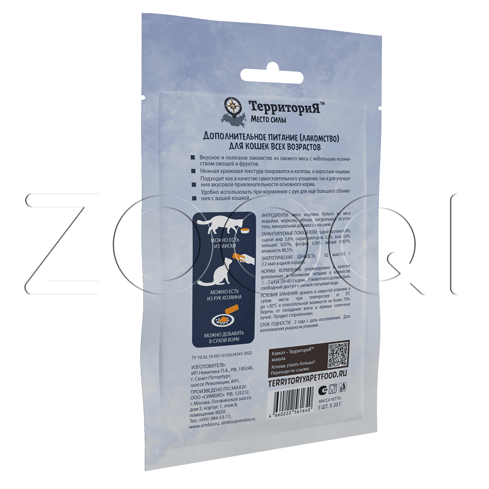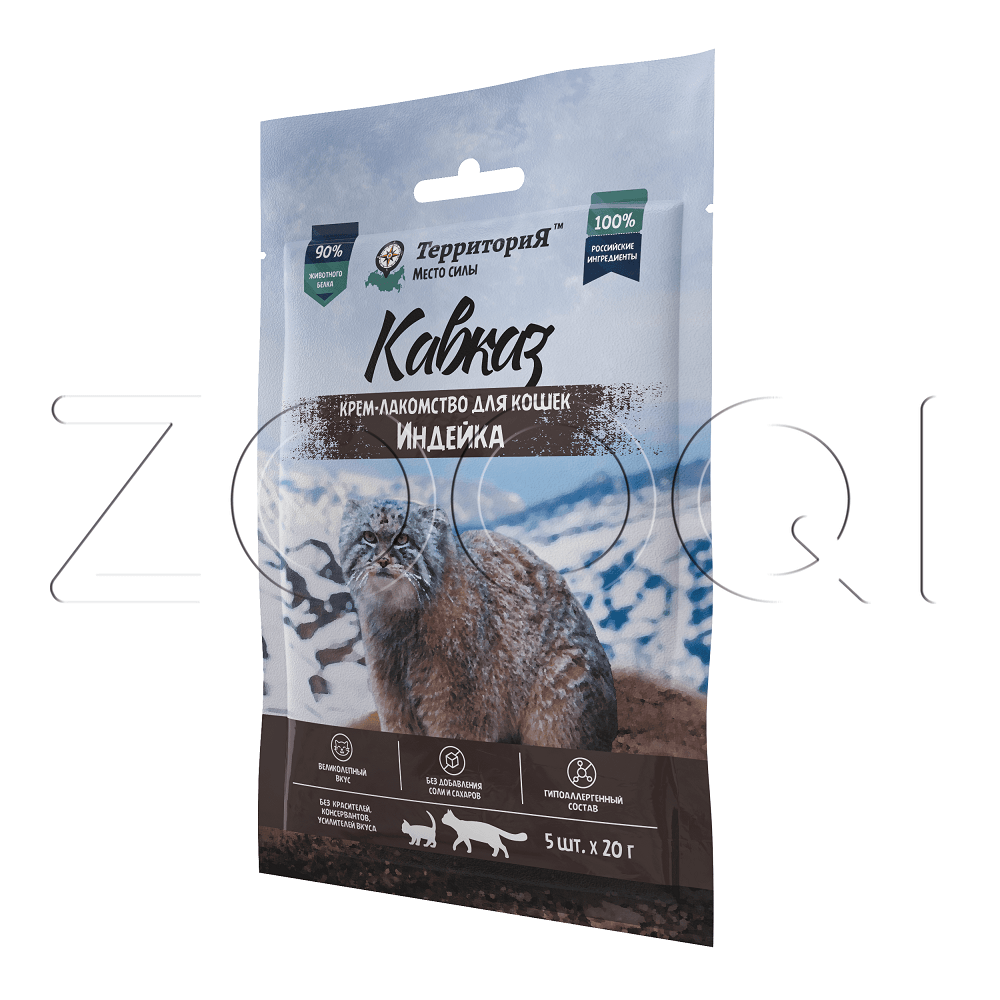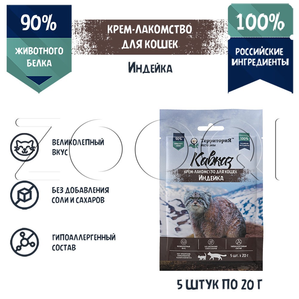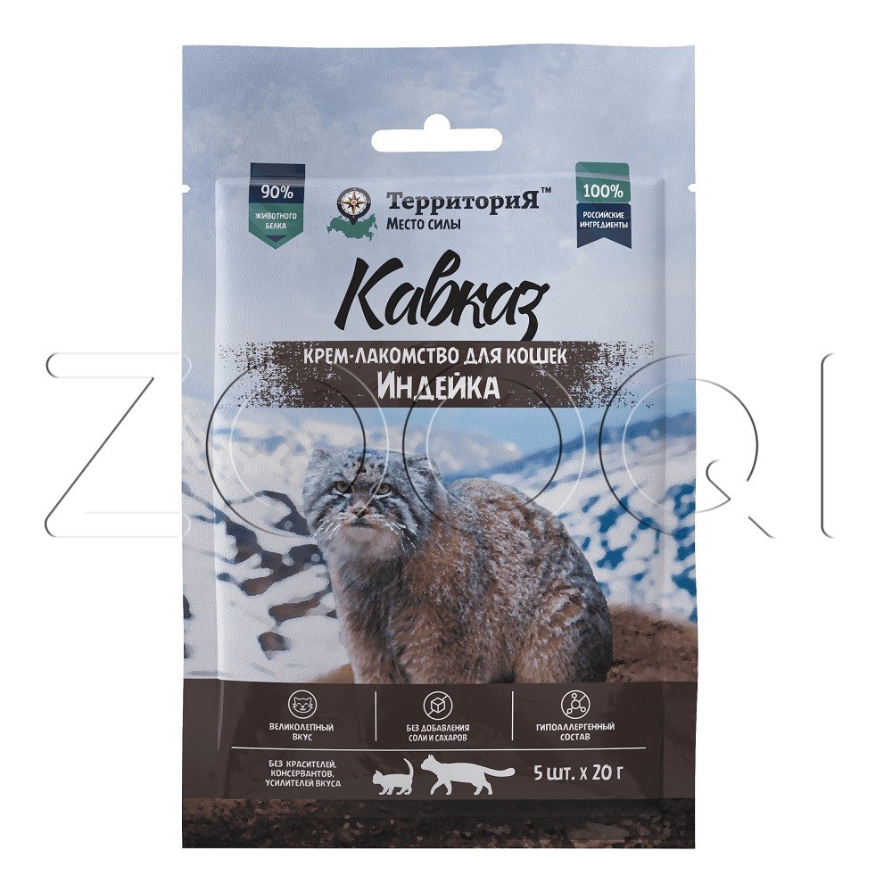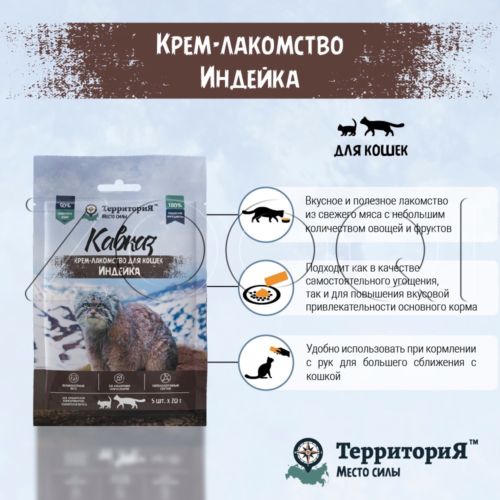 ТерриториЯ Кавказ Крем-лакомство для кошек «Индейка» – вкусное и полезное лакомство из свежего мяса с небольшим количеством овощей и фруктов. Нежная кремовая текстура понравится и котятам, и взрослым кошкам.