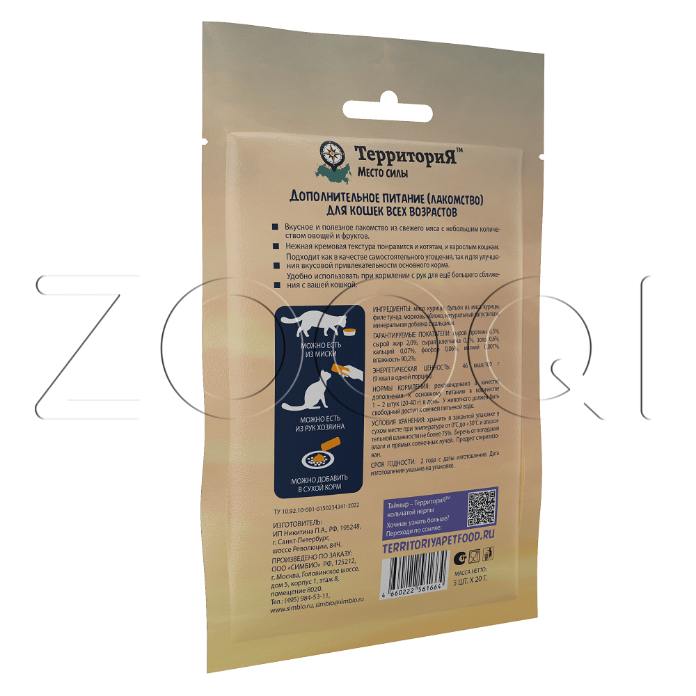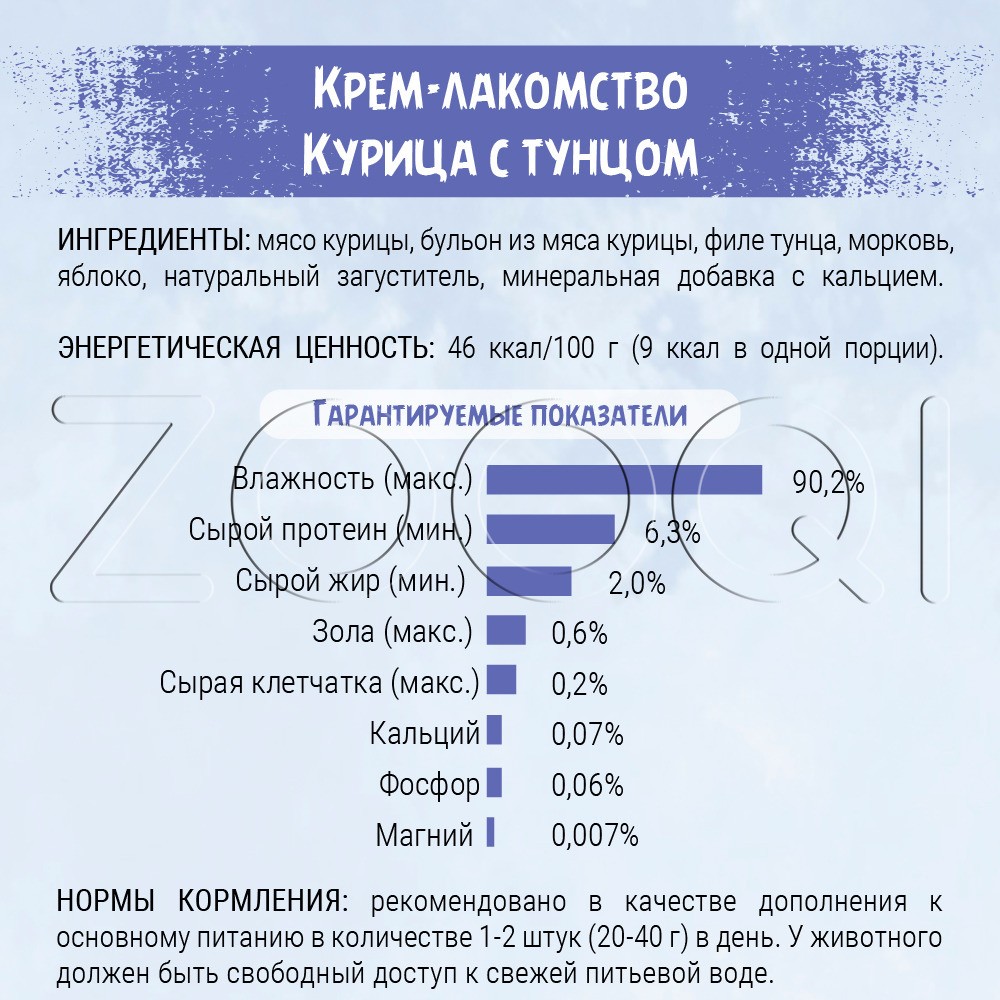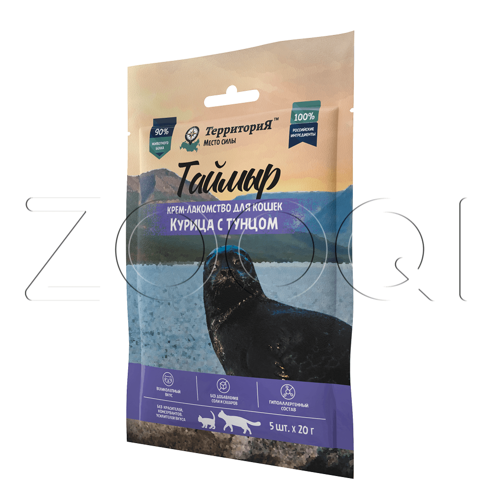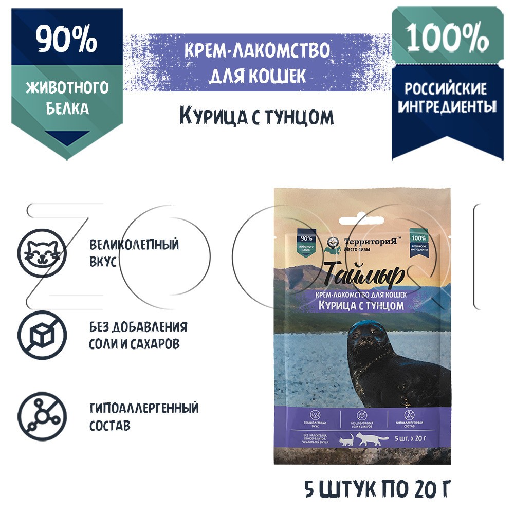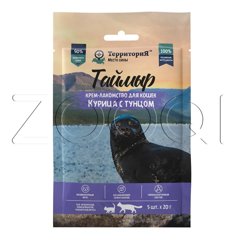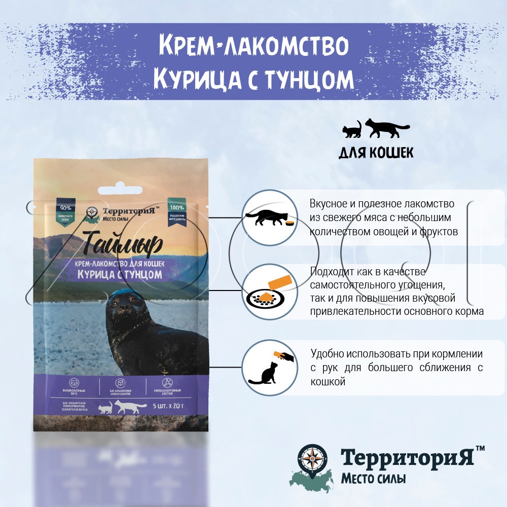 ТерриториЯ Таймыр Крем-лакомство для кошек «Курица с тунцом» – вкусное и полезное лакомство из свежего мяса с небольшим количеством овощей и фруктов. Нежная кремовая текстура понравится и котятам, и взрослым кошкам.