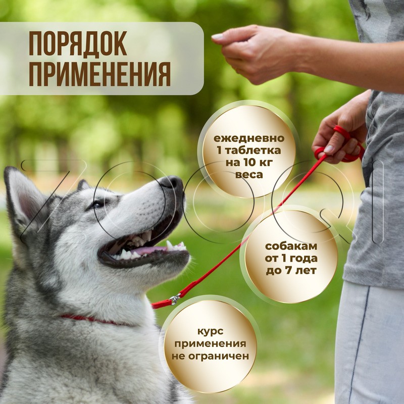 Добавку вводят собакам с кормом или дают перорально с руки, ежедневно, 1 раз в сутки из расчета 1 таблетка массой 1,5 г на 10 кг массы тела или 1 таблетка массой 0,75 г на 5 кг массы тела. Курс применения не ограничен.