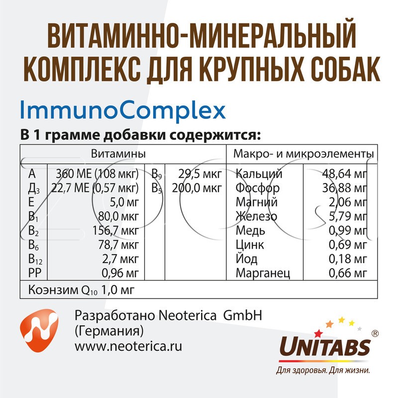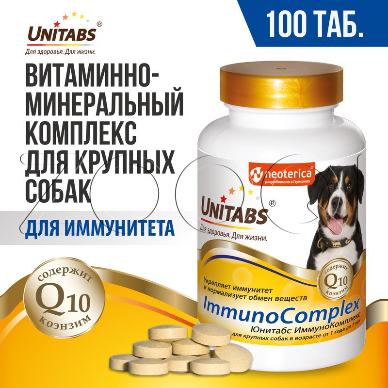 Unitabs ImmunoComplex (Юнитабс ИммуноКомплекс) – витаминно-минеральный комплекс для взрослых собак всех пород (от 1 года до 7 лет), который содержит коэнзим Q10 и все необходимые витамины, макро- и микроэлементы для нормализации обмена веществ и укрепления иммунитета.