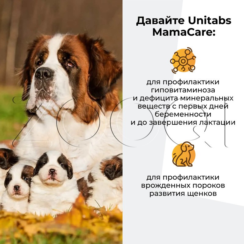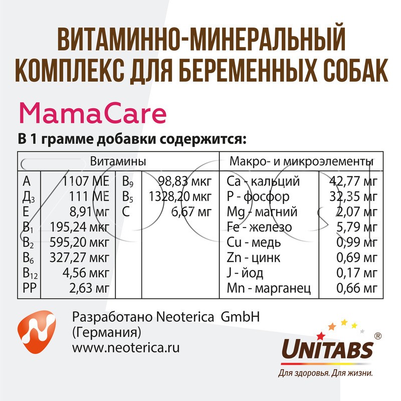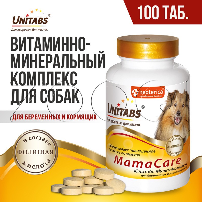 Unitabs МамаCare (Юнитабс Мульти Комплекс) – витаминно-минеральный комплекс для беременных и кормящих собак любого возраста и породы, который содержит все необходимые витамины, макро- и микроэлементы и фолиевую кислоту (витамин В9) для полноценного развития потомства.