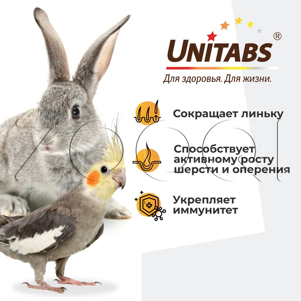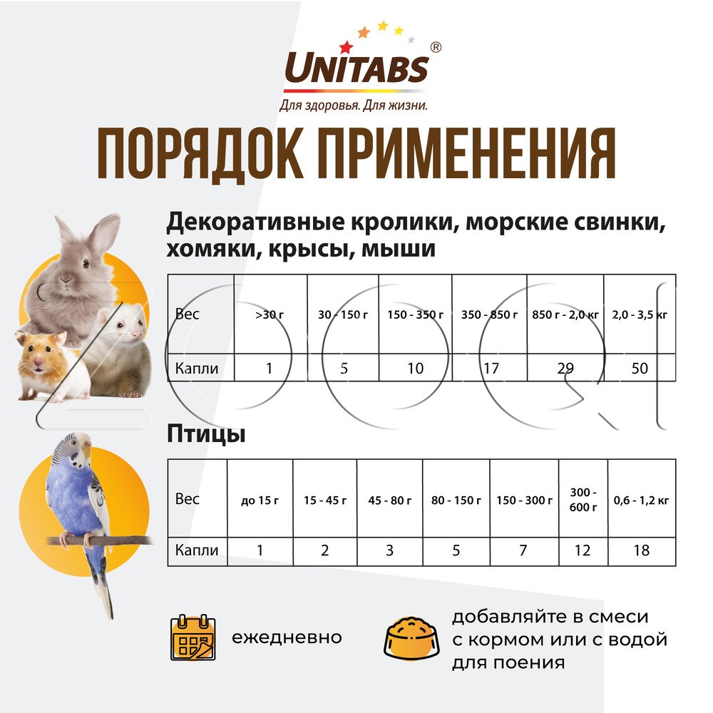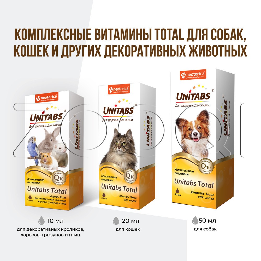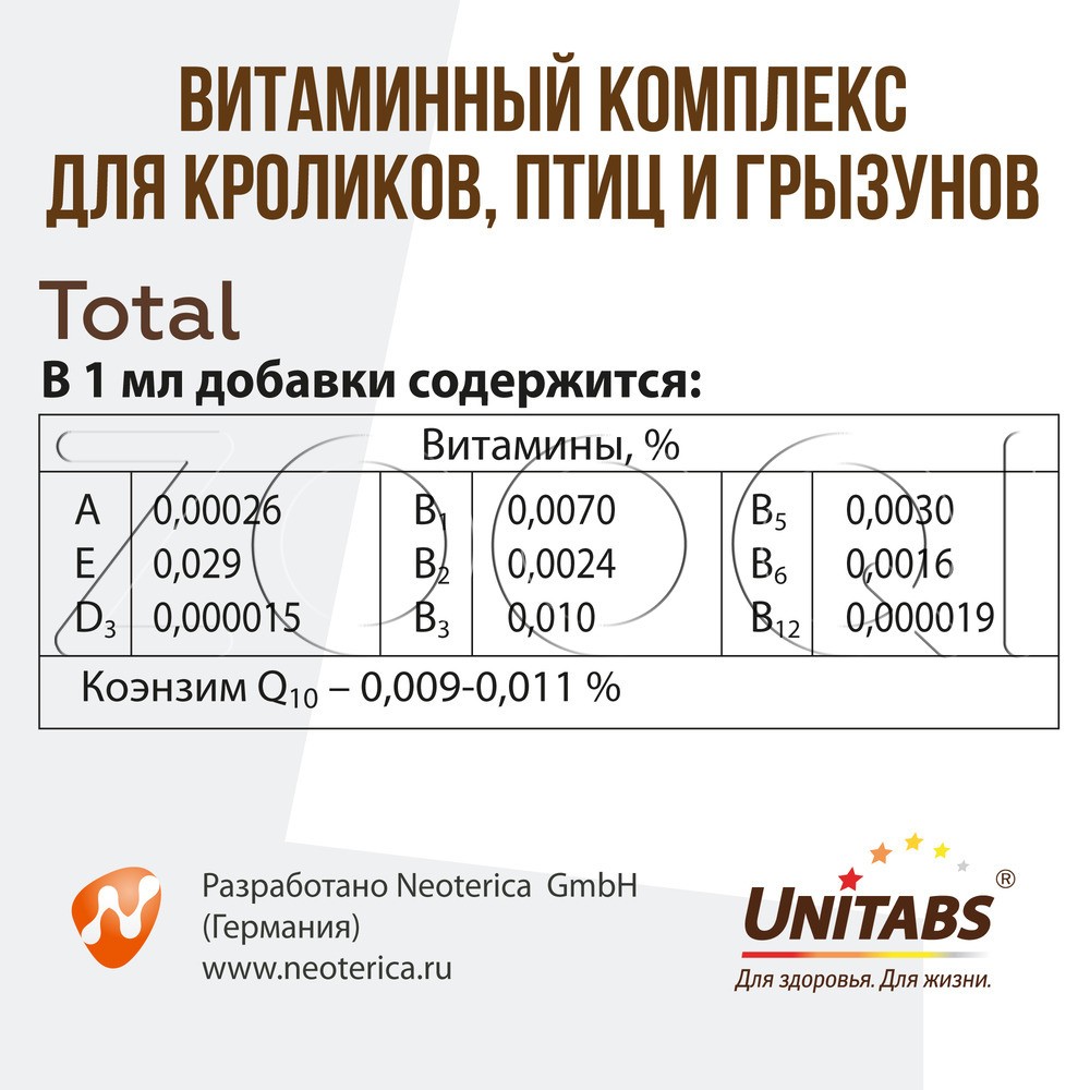 Unitabs Total (Юнитабс Тотал) – витаминный комплекс для птиц и грызунов, который содержит коэнзим Q10 и все необходимые витамины для улучшения состояния кожи, шерсти, оперения и иммунитета питомца.