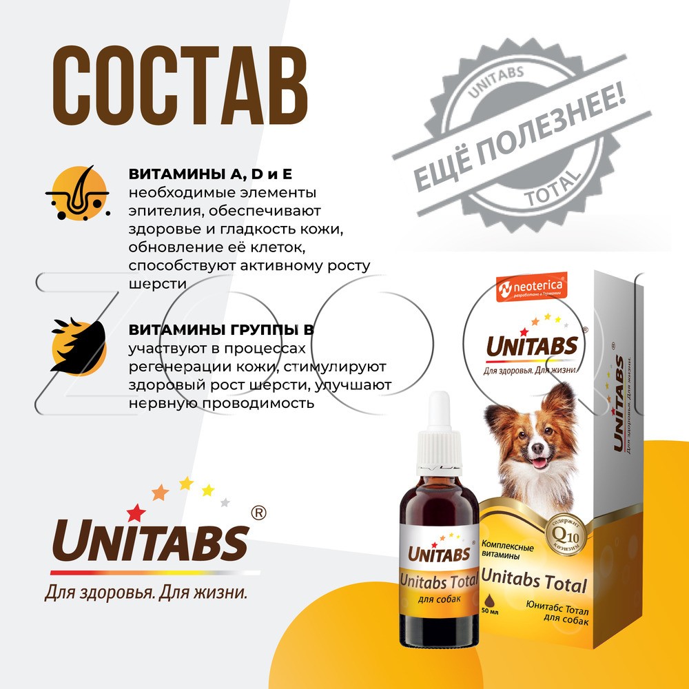 Unitabs Total (Юнитабс Тотал) – витаминный комплекс для собак любых пород, который содержит коэнзим Q10 и все необходимые витамины для улучшения состояния кожи, шерсти, иммунитета питомца.